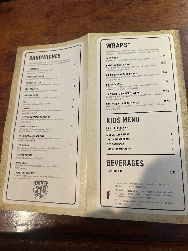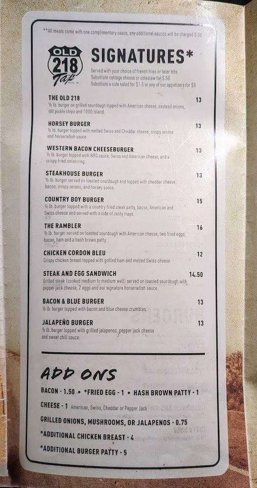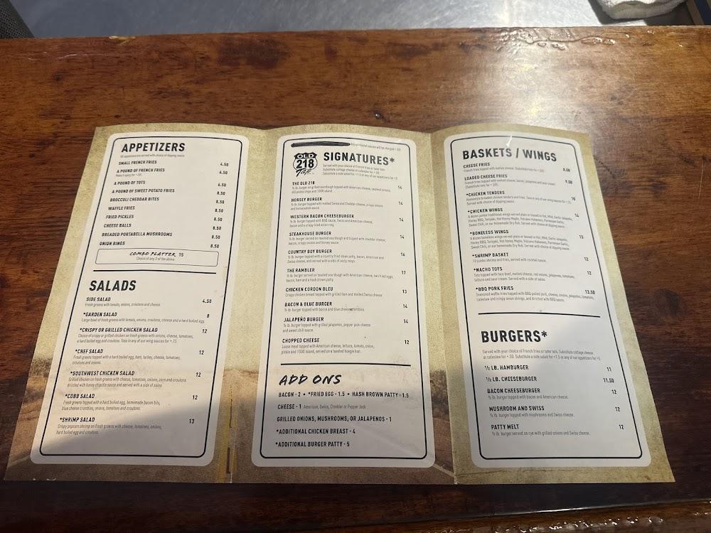 Old 218 Tap's menu is diverse and full of flavor. Burgers dominate the offerings, with numerous options that cater to different tastes. Wraps and baskets are also available, providing great variety. Dishes start at around $10, which is budget-friendly.